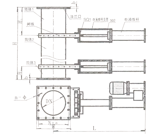 本閥為機(jī)、電、液、控于一體的卸料裝置,接通電源后,上閥電液推桿自動打開閘板,至限位開關(guān)(SQ2)后,停留數(shù)秒卸料,然后關(guān)閉上閥閘板,至限位開關(guān)(SQ1)后轉(zhuǎn)入下閥工作,下閥電液推桿打開閘板至限位開關(guān)(SQ4)后,停留數(shù)秒卸料,然后關(guān)閉下閥閘板至限位開關(guān)(SQ3)后轉(zhuǎn)入上閥工作。如此交替工作,至設(shè)定的卸灰量后,自動停止全過程工作。