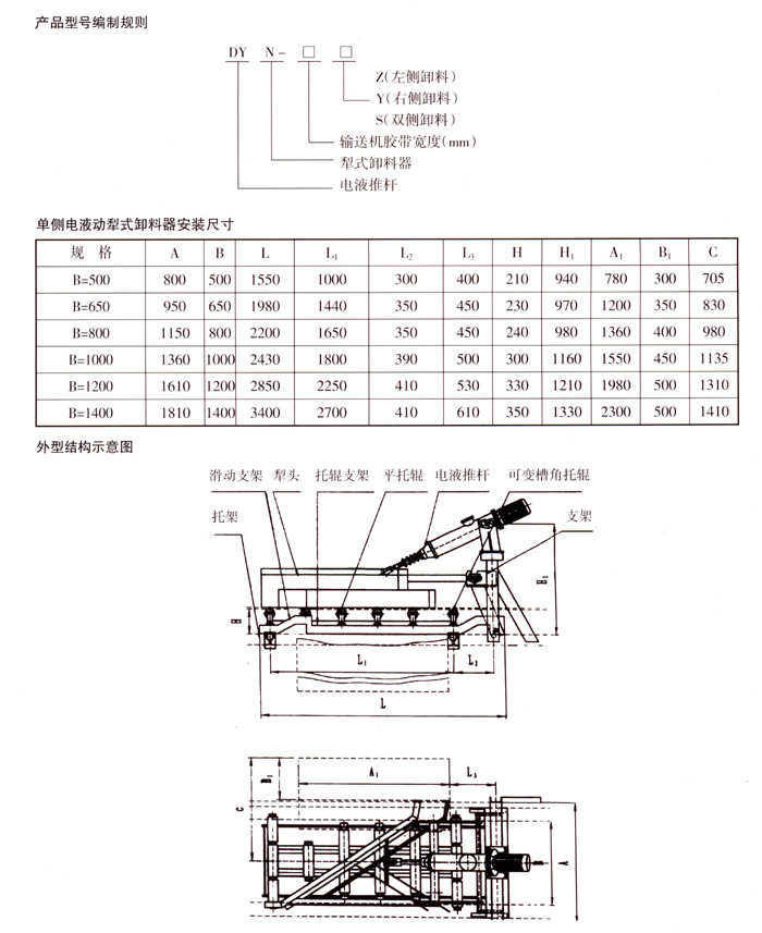 DYN-IV型電液動(dòng)犁式卸料器,是我公司和電力部中南電力設(shè)計(jì)院聯(lián)合開(kāi)發(fā)的產(chǎn)品之一,是安裝在膠帶輸送機(jī)上執(zhí)行卸料及控制物料輸送流量、流向的機(jī)械配套產(chǎn)品,可直接安裝在膠帶輸送機(jī)的中間架上,能將膠帶輸送的物料在中途均勻、連續(xù)地卸入漏斗(料斗)中,或卸到需要的場(chǎng)所去。
